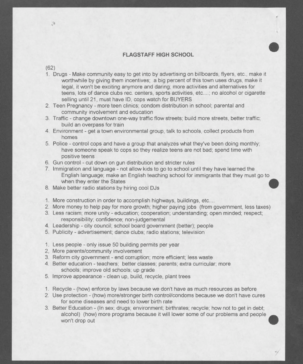 [Feedback from middle school and high school students in Flagstaff, Arizona regarding what they would want as part of Flagstaff 2020]. Circa 1996. Flagstaff 2020 Records [manuscripts], NAU.MS.294, Box 1, Folder 18. Click to view this item via Digital Collections.